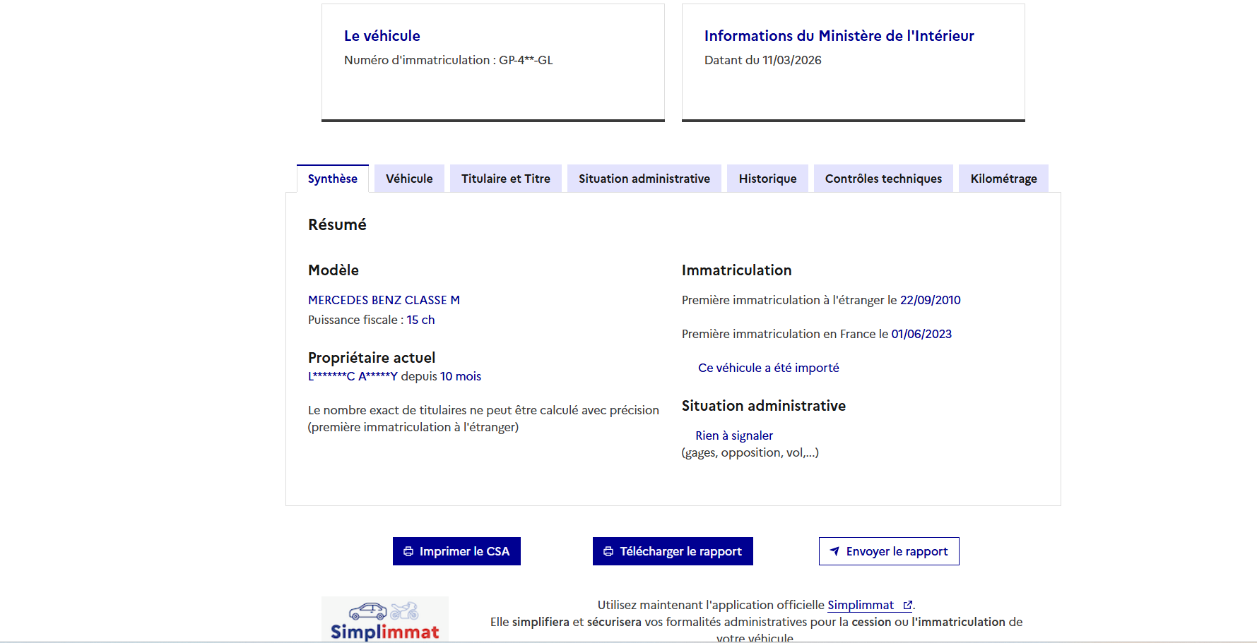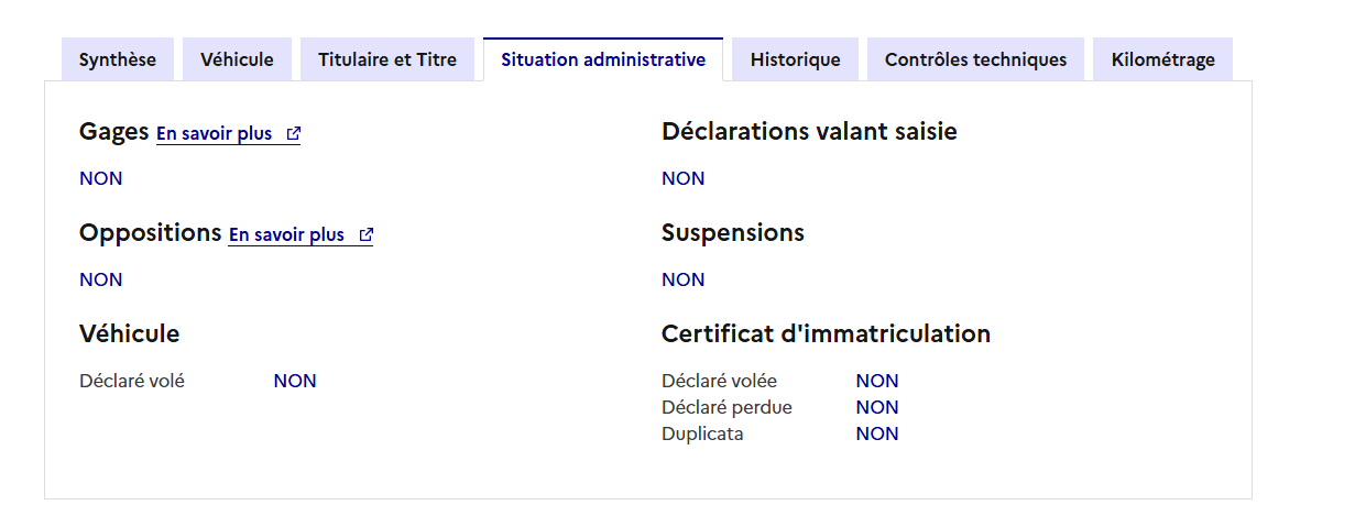 Le rapport indique si le véhicule a une opposition au transfert de carte grise.